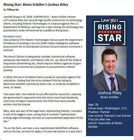 At the top of the list are a couple of multi-billion dollar law firms whom Mr. Riley has worked for. Boies, Schiller & Flexner have represented clients such as Theranos and even Harvey Weinstein while Mr. Riley was working there. While he himself was not a party to those clients, he chose to stay with the firm long after many of his colleagues left in protest. One client that Mr. Riley did represent was the big tech company Palantir, which you can read about here:
